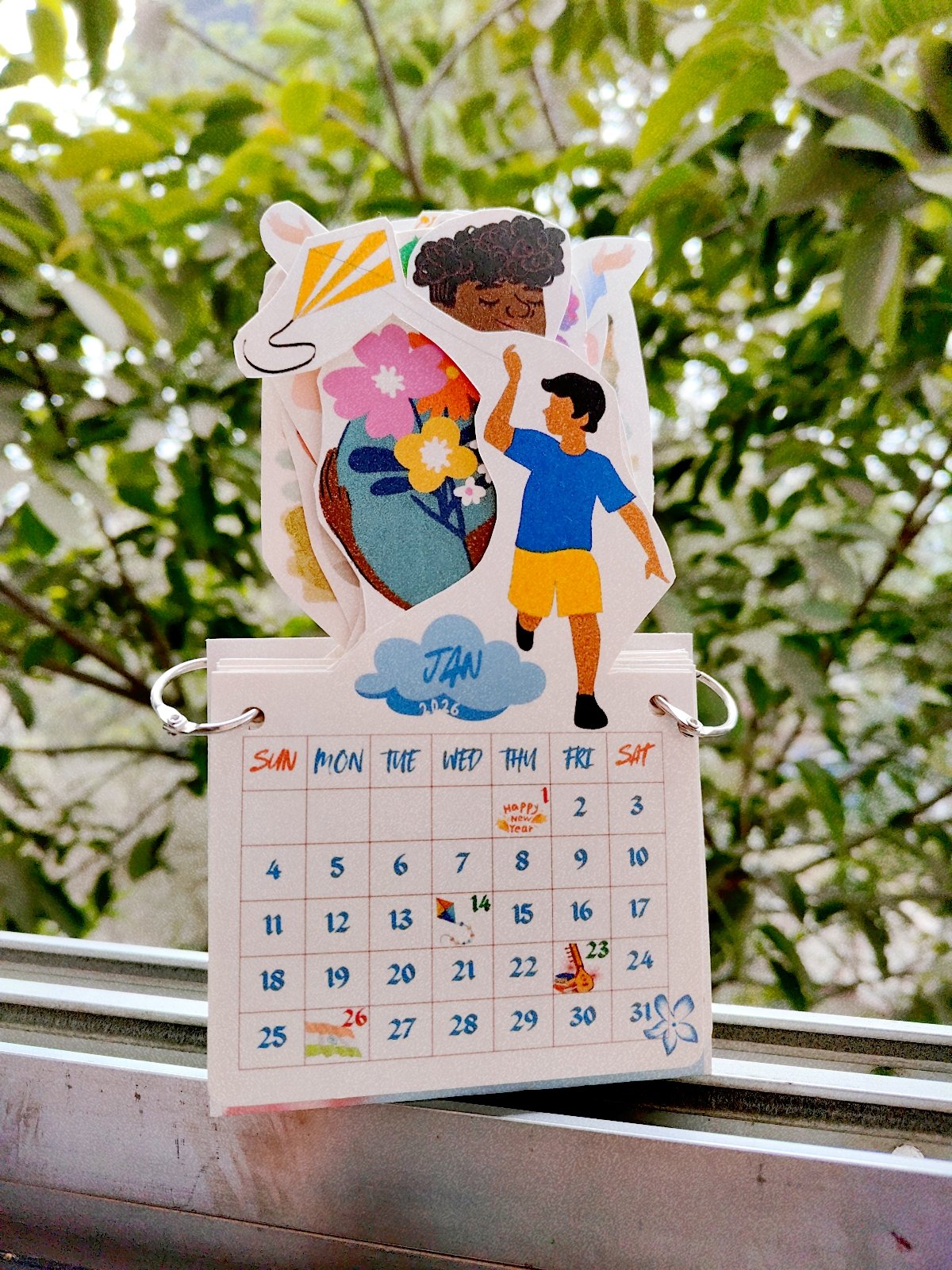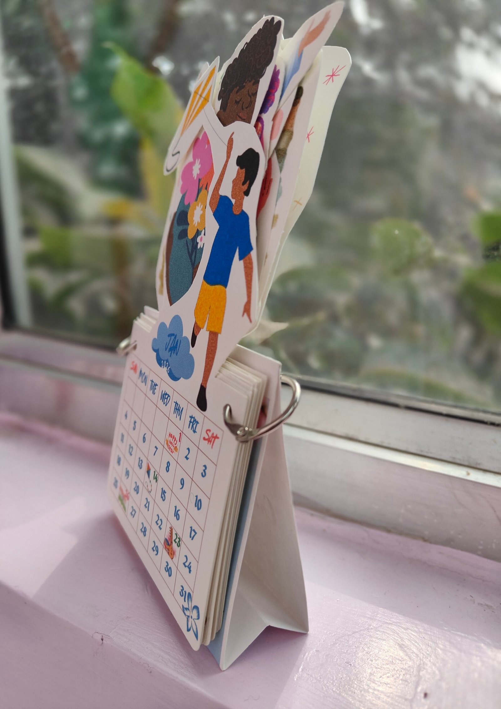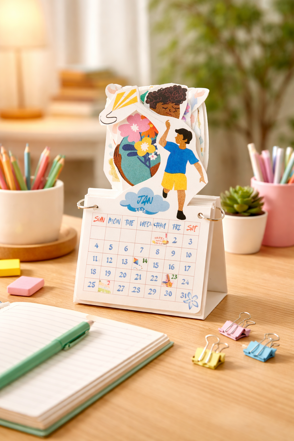 Add creativity to your daily planning with this cut-out table calendar designed to stand out on any desk. Each month features beautifully illustrated die-cut elements that give a layered, 3D look, making it more engaging than traditional calendars.