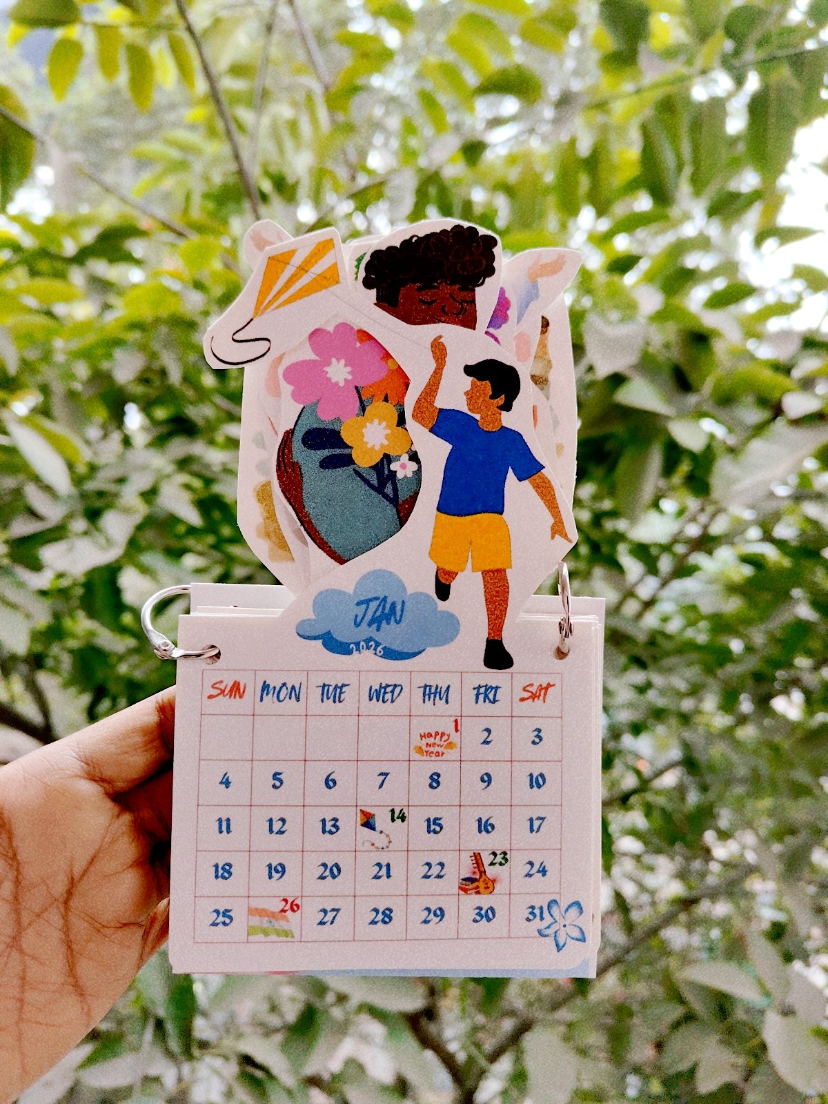 The calendar is ring bound for easy page turning and supported by a thick 300 GSM base that keeps it firmly in place. Its compact size makes it practical for everyday use while enhancing your workspace with artistic charm.